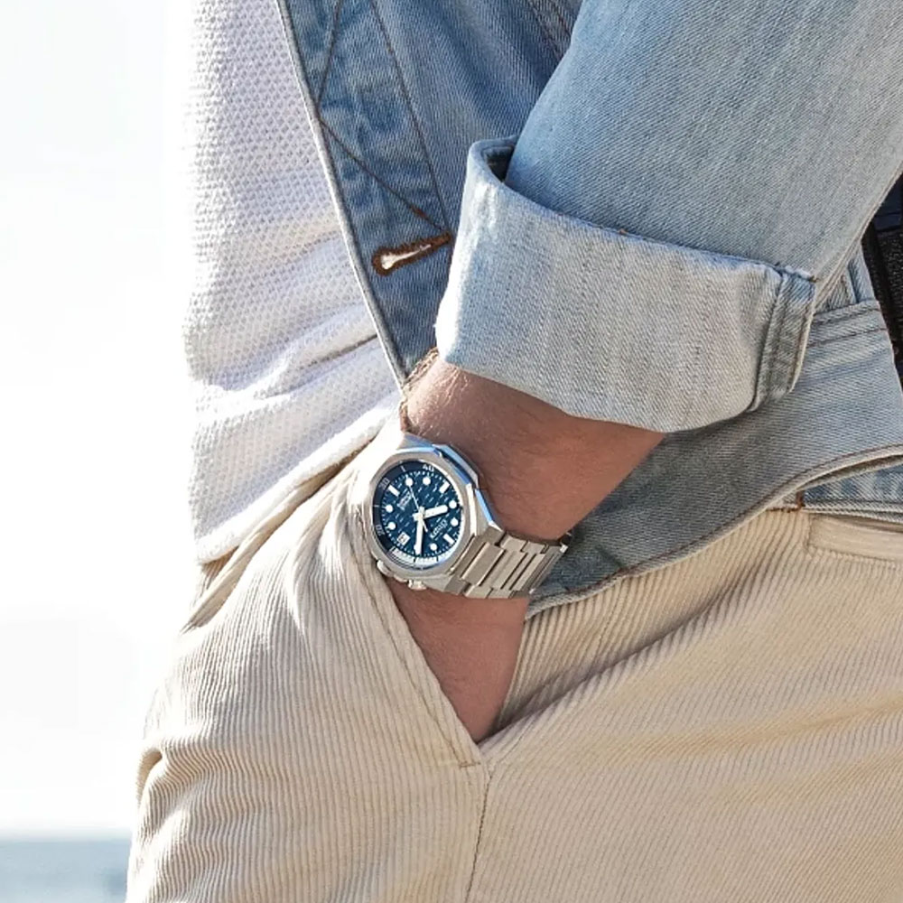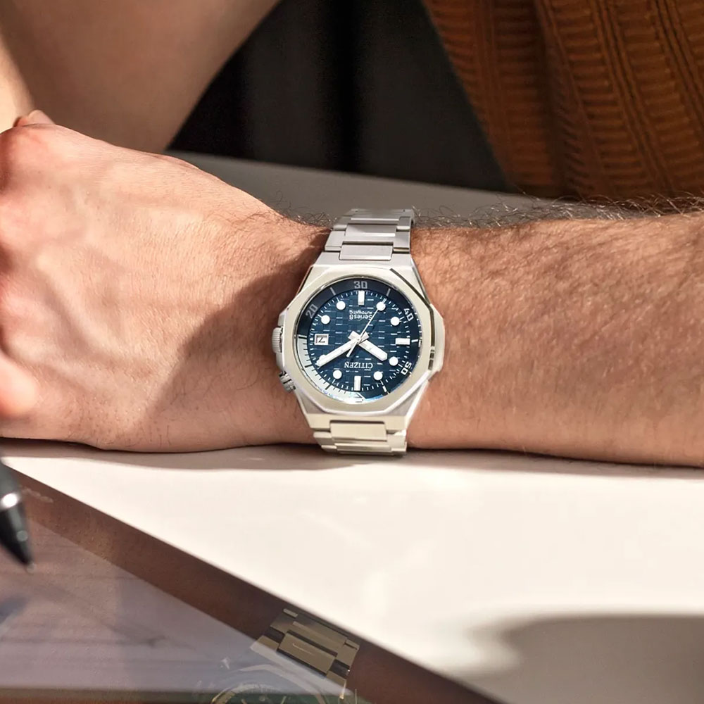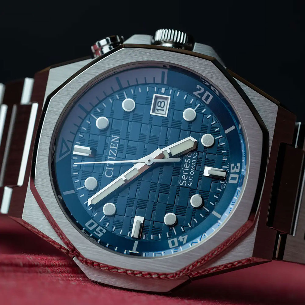 Dial colorBlue steel textured with Japanese checkered pattern inspired by Tokyo’s night sky and shows endless skyscrapers with square windows of different sizes that interpret the traditional Japanese checkerboard pattern (Ichimatsu pattern) in a modern way