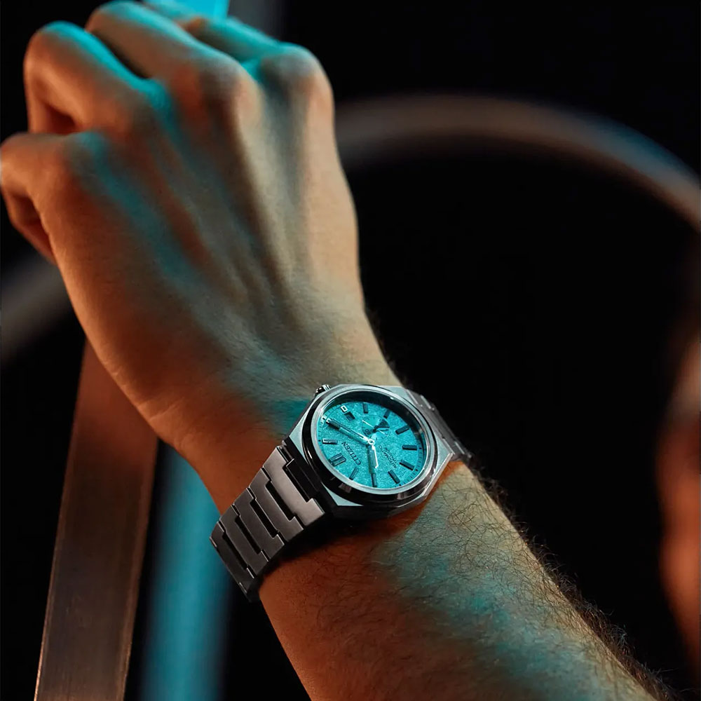 The Citizen NJ0180-80H watch has a case including the bracelet made of Super Titanium™, which guarantees low weight, high strength and complete anti-allergy properties. Thanks to a special hardening method (in this case Duratect TIC), the surface of this titanium is more resistant to scratches than stainless steel. Inside the case we find the Citizen 8213-21A mechanical in-house movement with automatic winding, which can also be wound manually by the crown. This movement operates at a frequency of 21,600 semi-frequencies per hour, features 21 jewels and an off-center seconds hand at the 4 o’clock to 5 o’clock position. Very practical is the date display function at the 3 o’clock position. The movement’s operation can be observed thanks to the transparent dial.