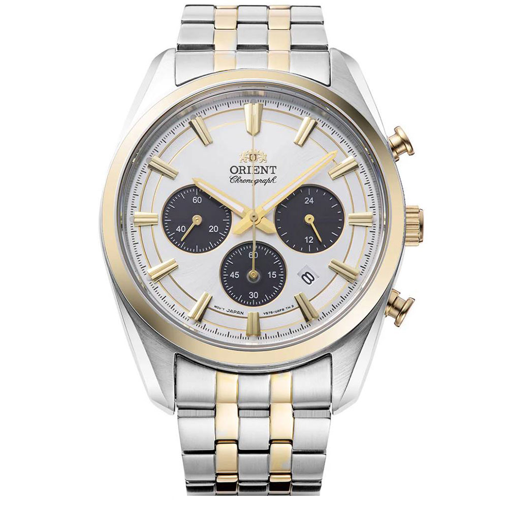 ORIENT Contemporary Solar Chronograph White Dial Two Tone Silver Gold Stainless Steel Bracelet Date Display Men’s Watch