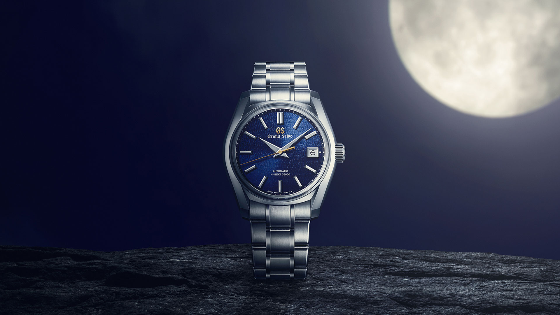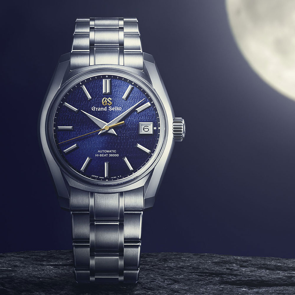 Dial ColorTextured dark blue creating a beautiful moonlit night with a contrast between the night sky and the moon with engraved gold tone Grand Seiko logo below the 12 o’clock position and Automatic Hi-Beat logo at 6 o’clock position
