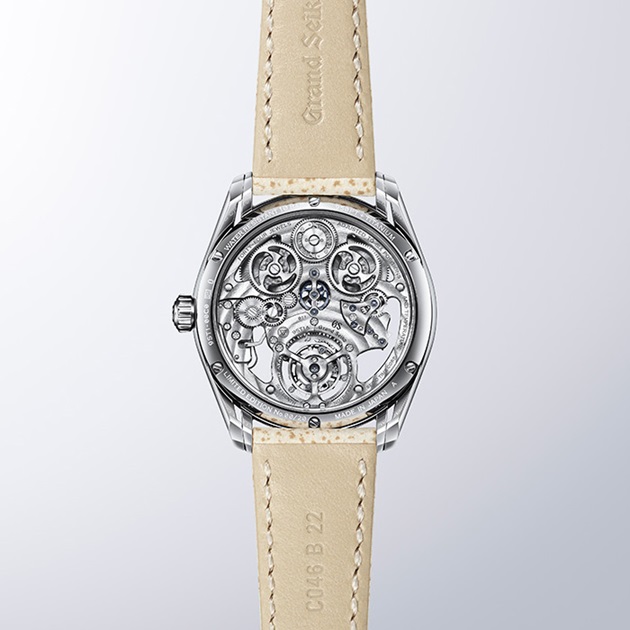The case is constructed from both Platinum 950 and Grand Seiko’s Brilliant Hard Titanium to achieve a long-lasting beauty. Some of the case parts in both materials are mirror polished and others have a hairline finish; both processes are completed by hand by highly skilled craftsmen and women to ensure that, from every angle, a visually pleasing harmony is revealed. The two case materials combine most evidently at the tapered end of the lugs where a small open space between each lug adds a lightness and unique aspect to the overall design.