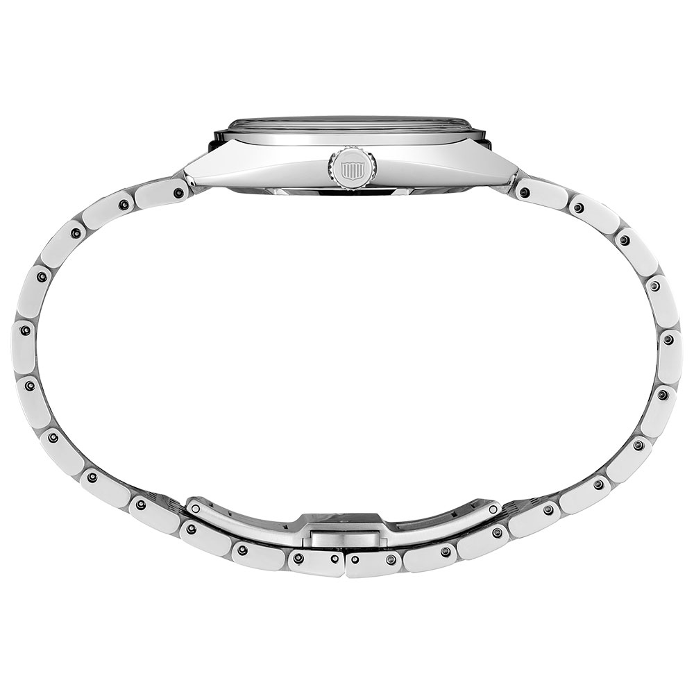 The redux echoes the original silhouette with its curved case shape, date feature and 12 o’clock index cut like an arrow feather. It features a narrow link bracelet in true Seiko Sixties style of the time.