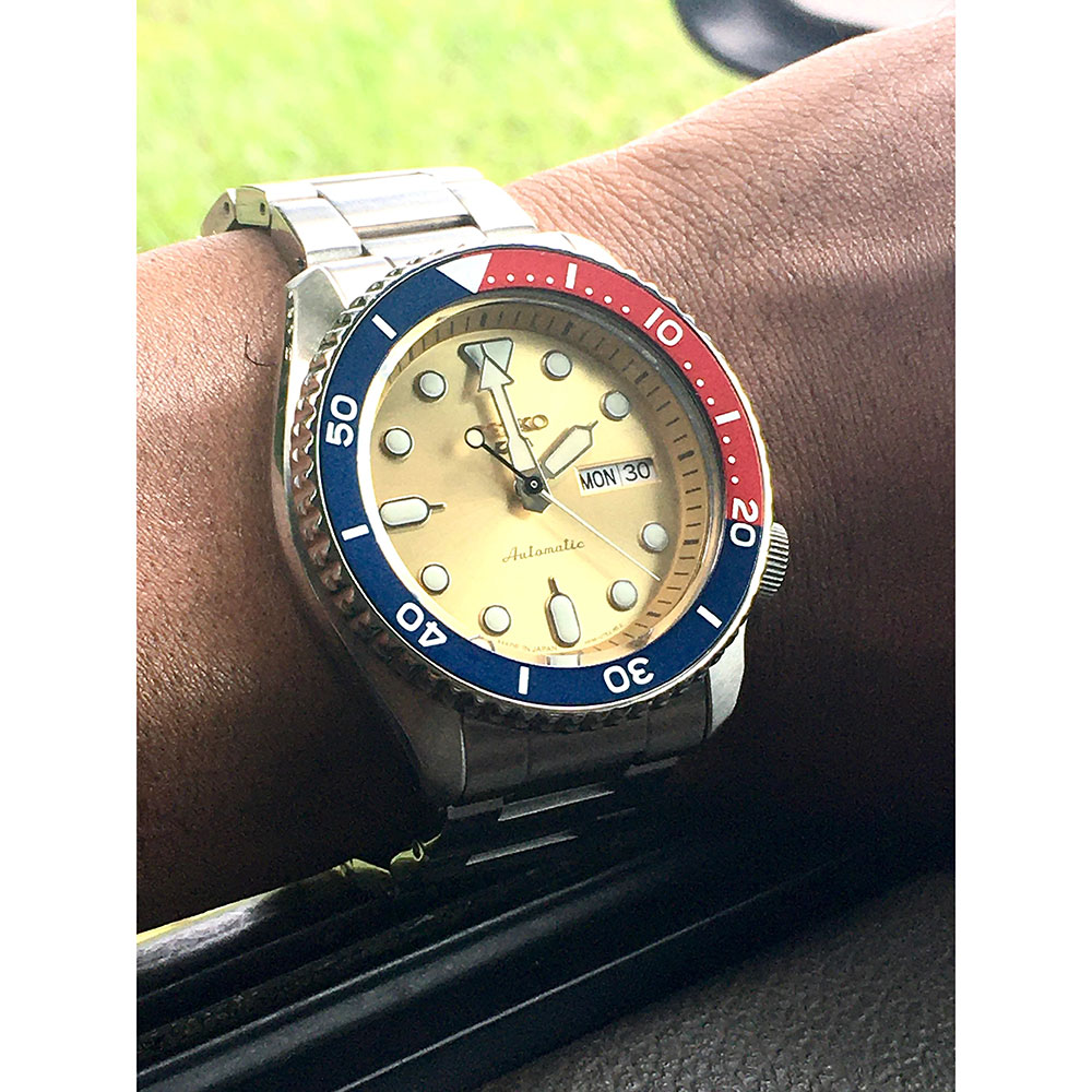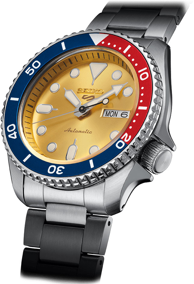 This watch incorporates a gold color dial combined with a bezel with red and blue accents, adding a fresh timepiece to the Seiko 5 Sports collection.