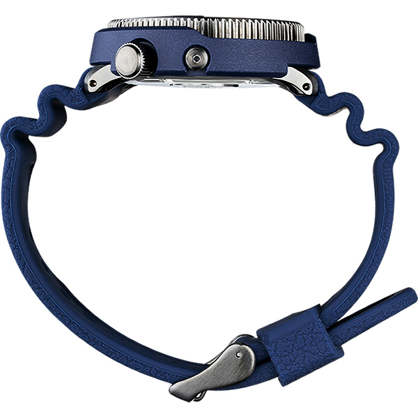 A leather pattern process is applied to a high-strength silicone accordion strap. It is designed to match equally well in town and the great outdoors.