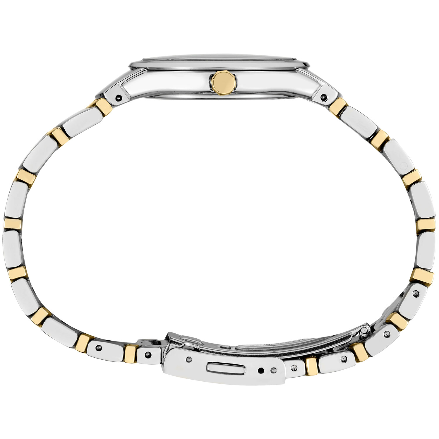 From the Essentials Collection. With sleek sophistication, this distinctively modern watch makes an immediate style statement. The clean, minimalist dial, in light champagne with simple stick markers, features a subtly varying metallic texture for added visual interest, while the soft curves of the bracelet are highlighted by a mirror and hairline finish. In stainless steel with versatile two-tone finish, this memorable timepiece includes a tri-fold push button release clasp. 5 bar, 50M Water Resistant.