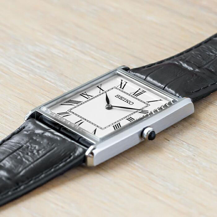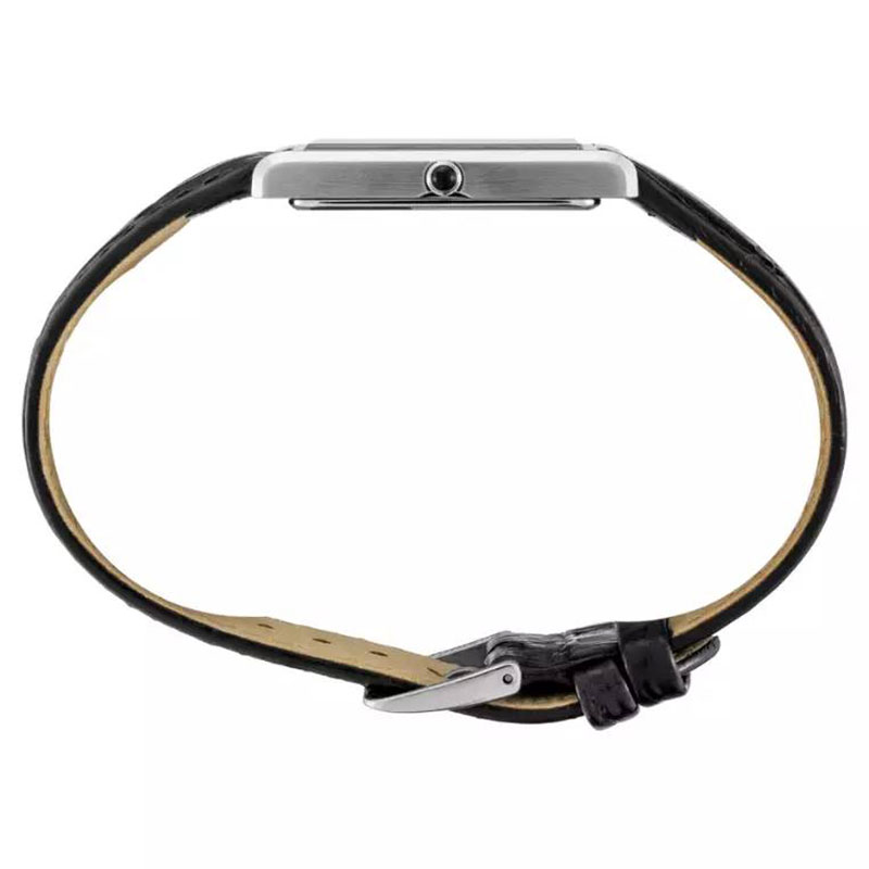 From the Essentials Collection. A sophisticated classic, perfectly proportioned for a jewelry-like feel, this elegant rectangular case watch offers a patterned white Roman numeral dial, black hands and a blue cabochon crown. Crafted of stainless steel, this graceful design includes a leather strap for sleek wearing comfort, and buckle clasp. 50 M Water Resistant.