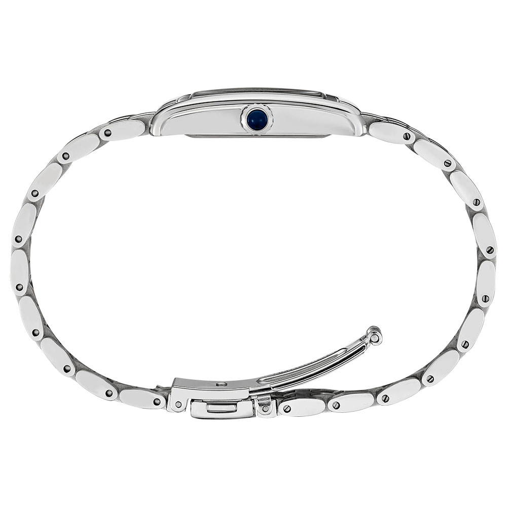 From the Essentials Collection. A sophisticated classic, perfectly proportioned for a jewelry-like feel, this elegant rectangular case watch offers a patterned blue Roman numeral dial, silver hands and markers, and a blue cabochon crown. Crafted of stainless steel, this graceful design includes a five-row stainless steel bracelet for sleek wearing comfort, and a tri-fold push button release clasp. 5 bar, 50m Water Resistant.